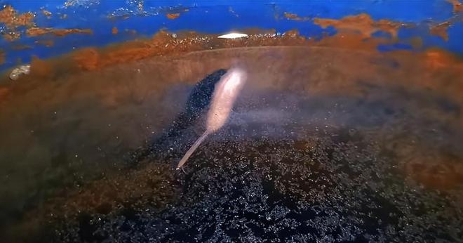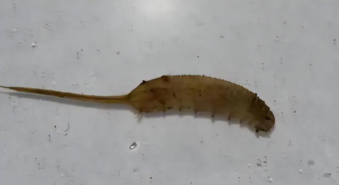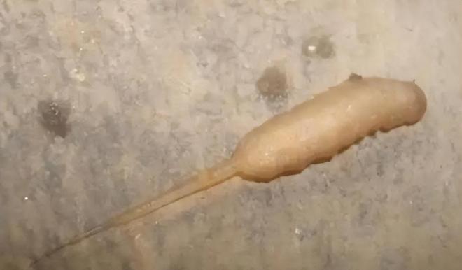 视频中可以看到一只白色的肉虫子在水下不断耸动扭曲,隐约可见其体内有一条黑色的线,应该是消化道之类的。最显眼的特征还是其身后居然拖着一条长度接近本体的”尾巴“,那条尾巴似乎没有身体那边柔软灵活,并不能伴随着虫子的活动而扭动。