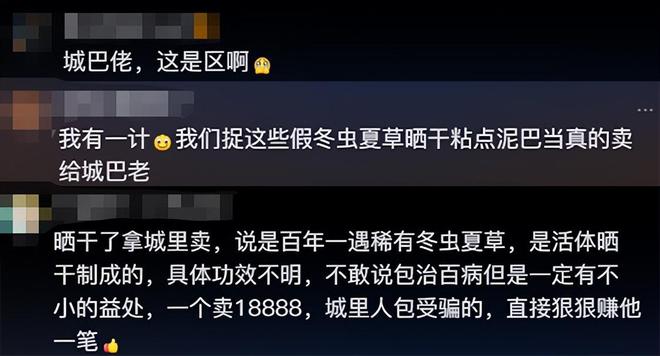 此话一出,评论区炸开了锅,大家都觉得太好笑了,戏称博主是”城巴佬“,居然这都不认识。甚至不少人开始谋划着准备抓些鼠尾蛆晒干再粘点泥巴带去城里卖,就骗”城巴佬“说是百年难得一遇的冬虫夏草!随便定个价就能赚一笔。