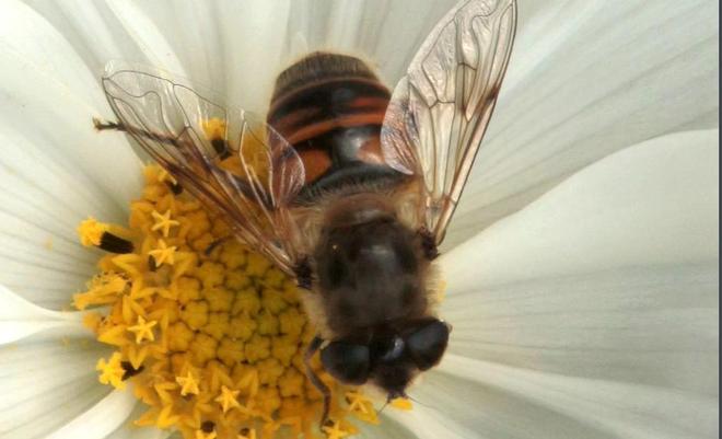 但看其头部却明显像是苍蝇,大家看图就能理解了。它们模仿蜜蜂模仿得连食性都给抄过来了,成虫就是吸花蜜的,不会像真苍蝇那样来骚扰我们。但它们又学得不够彻底,长大后虽然看似蜕变了,但幼体却会被某些品种的成虫给产在污水粪坑或臭水潭中,然后在那边孵化成长,因为长得太吓人,就变成了刻板印象。